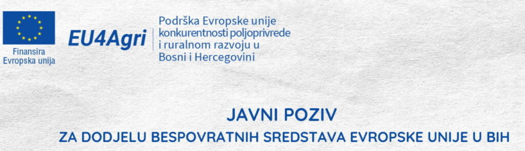 2. Javni poziv za mjeru podrške investicijama u prerađivačke kapacitete i marketing poljoprivredno-prehrambenih proizvoda u okviru projekata EU4AGRI i EU4AGRI Recovery:                                                                                                      Javni poziv potencijalnim korisnicima bespovratnih sredstava za mjeru potpore za ulaganja u prerađivačke kapacitete i marketing poljoprivrednih i prehrambenih proizvoda.                                                                                                           Projekti EU4AGRI i EU4AGRI-Recovery raspisuju novi Javni poziv za potencijalne korisnike bespovratnih sredstava za mjeru potpore za ulaganja u prerađivačke kapacitete i marketing poljoprivrednih i prehrambenih proizvoda, vrijedan 5 milijuna KM.Ovaj javni poziv, kao i smjernice za potencijalne prijavitelje, isključivo se odnose na mjeru potpore u prerađivačkim kapacitetima poljoprivredno-prehrambene industrije kroz uvođenje inovacija i razvoj novih i/ili poboljšanje postojećih proizvoda, marketinških alata. , te osiguravanje kontinuiteta poslovanja i sigurnog i zdravog radnog okruženja.Tko se može prijaviti?Obrti, poduzetnici, zadruge i trgovačka društva, mikro, mala i srednja poduzeća koja zapošljavaju manje od 250 radnika, te svi projekti koji se odnose isključivo na proizvodnju  proizvoda za ljudsku prehranu  i unutar sektora: prerada voća, prerada gljiva, ljekovito bilje, ljekovito bilje , vinarstvo i prerada maslina, prerada povrća, prerada mlijeka, prerada meda, prerada mesa, prerada jaja, prerada i konzerviranje ribe, prerada žitarica te proizvodnja gotove hrane i jela.Na ovaj javni poziv prijavitelji mogu podnijeti samo jednu prijavu . Prijave za projekte definirane ovim javnim pozivom prijavitelji mogu podnositi isključivo samostalno. Prijave više prijavitelja unutar jednog prijedloga neće se uzimati u obzir. Podnositelji su odgovorni za realizaciju projekta, uključujući i financijske obveze.